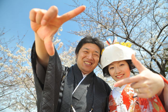 ウエルカムボードも、お二人の自然な表情と青い空、桜のロケーションがマッチしてとても、喜んで