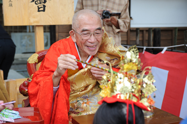 みんな目をキラキラさせて、嬉しそうです。3歳の男の子も重たい刀を一生懸命に持ちます